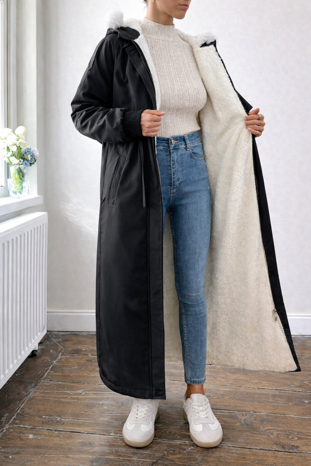 İÇİ PELUŞ KÜRKLÜ, UZUN KAPÜŞONLU KABAN